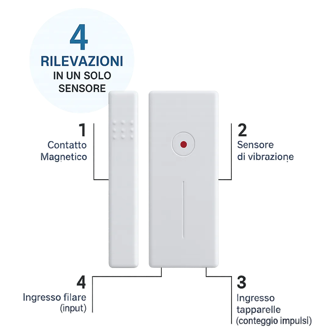Adatto a legno, metallo, vetro, mattoni e plexiglass, offre sensibilità regolabile e ingressi per sensore tapparella con contaimpulsi integrato o filare esterno quale ad esempio un contatto magnetico.